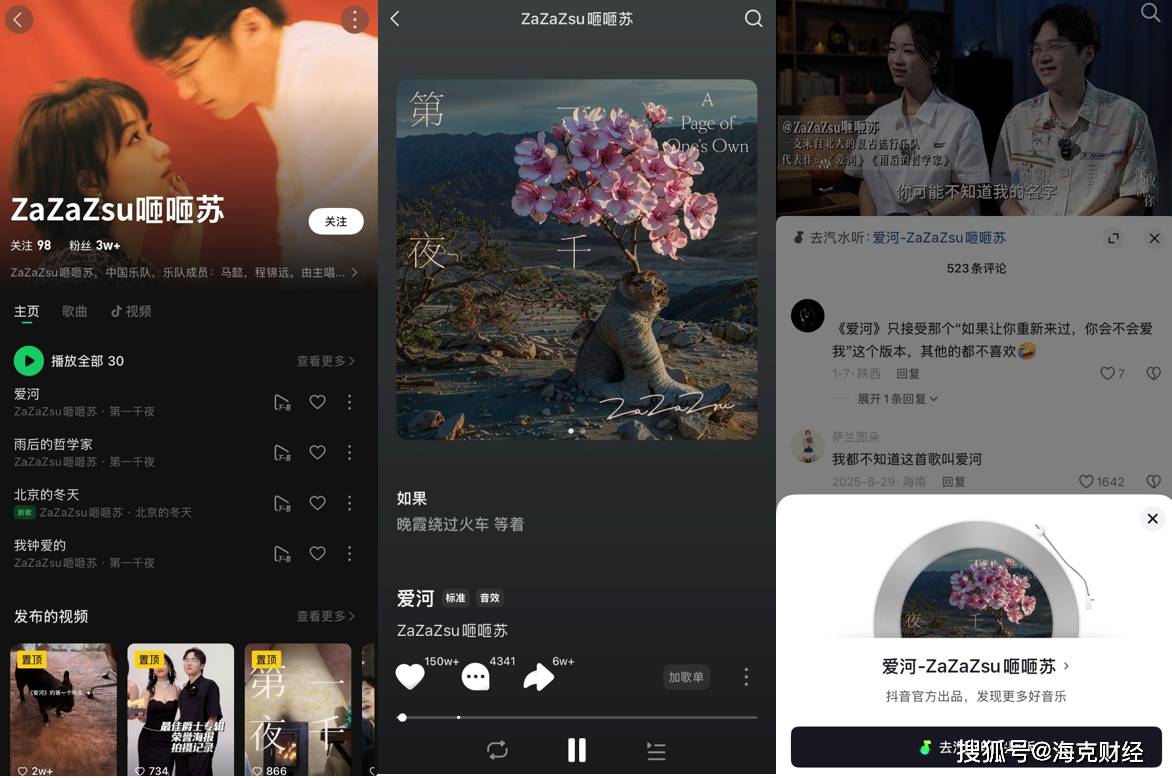 音乐人通过“抖音音乐开放平台”发行作品后,可利用平台的“黑马歌曲监控”“潜力线索雷达”等数据工具洞察歌曲表现。比如乐队ZaZaZsu,其歌曲《爱河》先在汽水音乐完成算法冷启,积累45万+红心后,再通过抖音进行“种草”传播,最终实现了全网播放破38亿的现象级扩散。