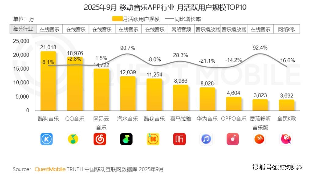 调研机构QuestMobile于2025年11月5日发布的数据显示,国内传统头部移动音乐平台月活跃用户规模(MAU)普遍陷入增长乏力状态甚至下滑趋势明显,截至2025年9月底,腾讯音乐娱乐集团(TME)旗下酷狗音乐以约2.10亿月活位居行业首位,同比下降8.1%;同属腾讯音乐娱乐集团旗下的月活约1.90亿,位居行业第二位,同比下降2.8%;网易云音乐月活约1.47亿,位居行业第三位,同比仅微增1.5%;与这些平台形成鲜明对比的是,汽水音乐实现了同比90.7%的高速增长,月活突破1.20亿,已攀升至行业第四位,成为国内移动音乐市场增长新引擎。