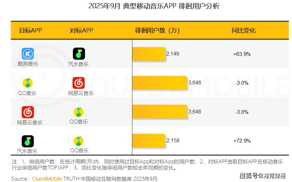 同据QuestMobile数据,截至2025年9月底,汽水音乐与酷狗音乐、徘徊用户数已分别达2149万、2158万,且同比分别大幅提升63.9%和72.9%,可见市场竞争加剧;而与网易云音乐互为最大的徘徊用户来源,同比小幅下降3%,用户在两平台间双向流动达到暂时动态平衡点。换句话说,腾讯系和网易系两大移动音乐阵营已进入战略相持阶段,但后起之秀汽水音乐不但月活一路猛增,而且它还在拓展空白地带的同时,继续大力淘洗和吸纳如上两个竞争对手的存量用户,国内移动音乐市场或将迎来深层次重构。