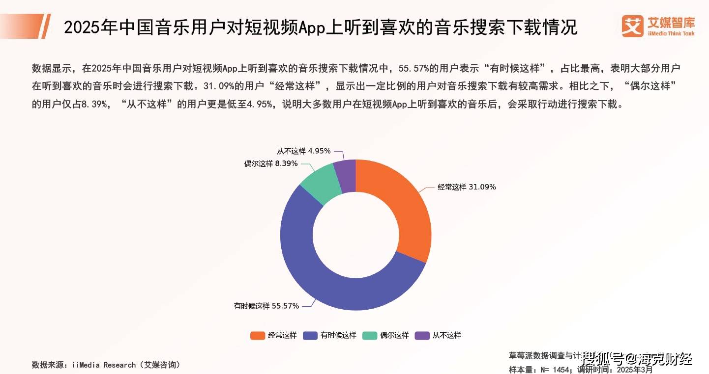 调研机构艾媒咨询2025年4月发布的《2025年中国音乐行业市场消费行为调查数据》显示,93.26%的中国音乐用户在短视频APP上遇到过喜爱的背景音乐,其中95.05%会主动搜索下载这些音乐,这构成了全球最大的音乐发现场景。